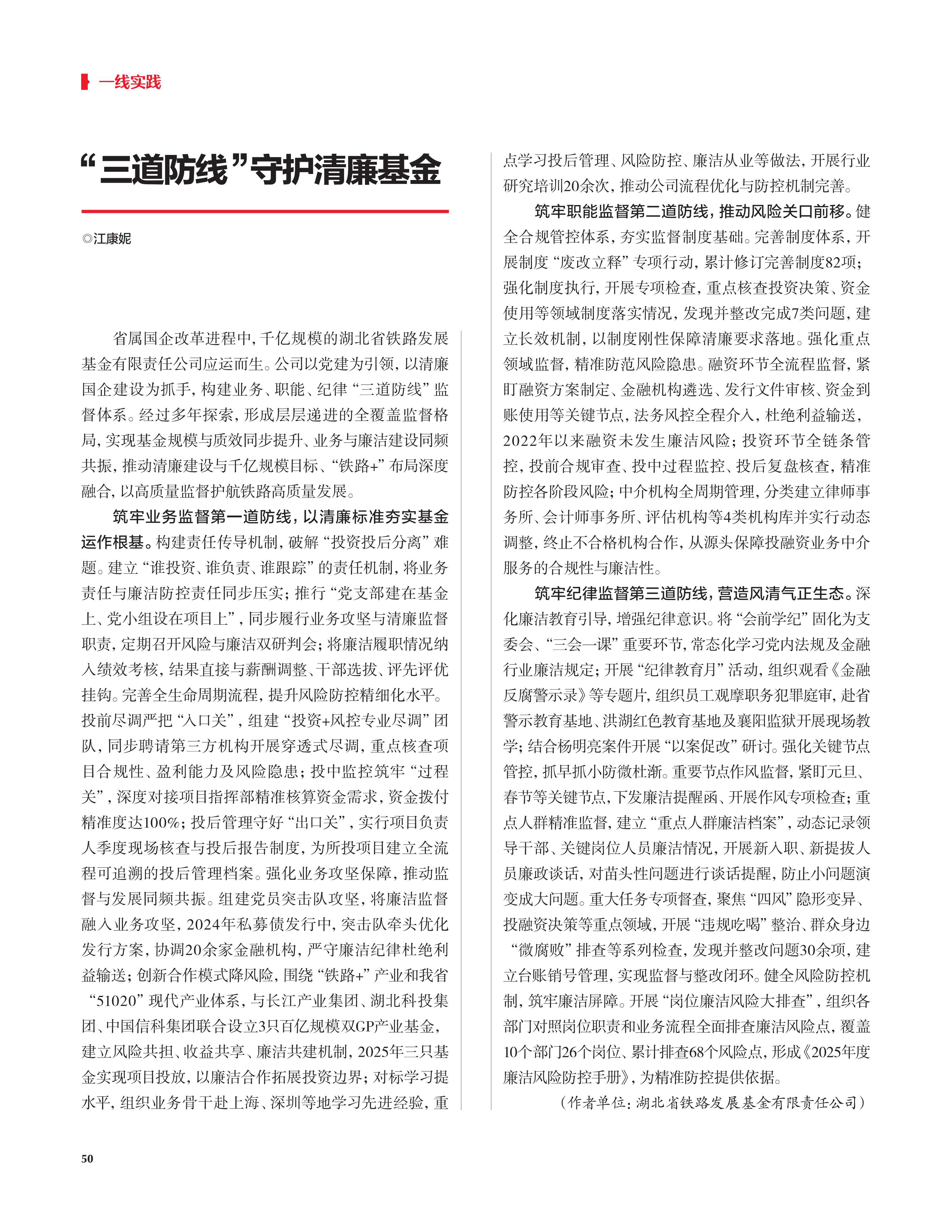 近年来,湖北铁路集团始终高度重视清廉国企建设,持续探索清廉建设与企业经营深度融合的有效路径。集团所属铁路基金公司通过创新构建业务、职能、纪律 “三道防线” 监督体系,实现了基金规模与质效的同步跃升、业务发展与廉洁建设的同频共振。近日,《党员生活》杂志登载了《湖北省铁路发展基金有限责任公司:“三道防线”守护清廉基金》文章,展示了基金公司推进清廉国企建设的作法及成效。全文如下: