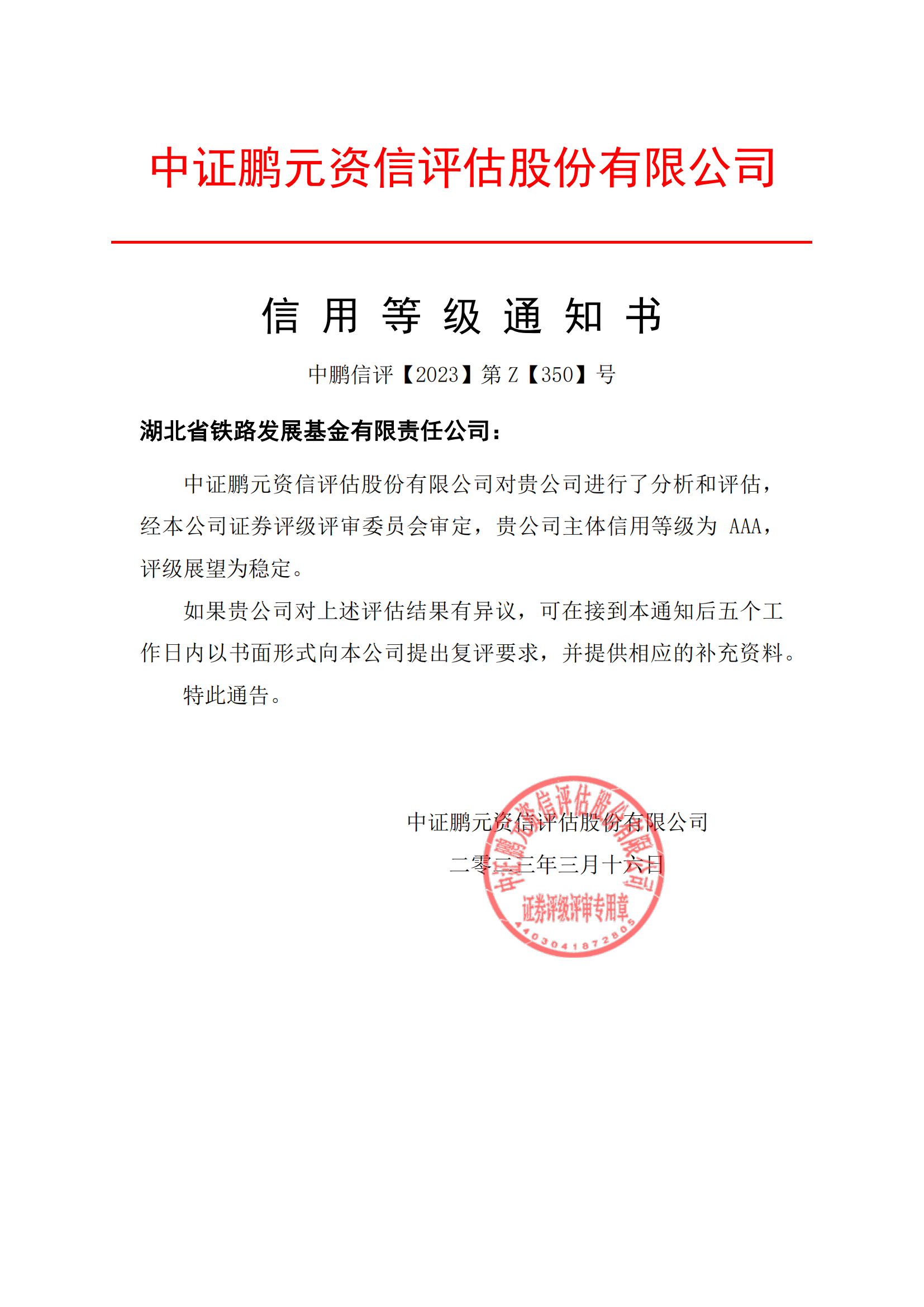 3月16日,经国内权威信用评级机构中证鹏元资信评估股份有限公司评定,湖北铁路发展基金公司主体信用等级AAA,评级展望为“稳定”。
