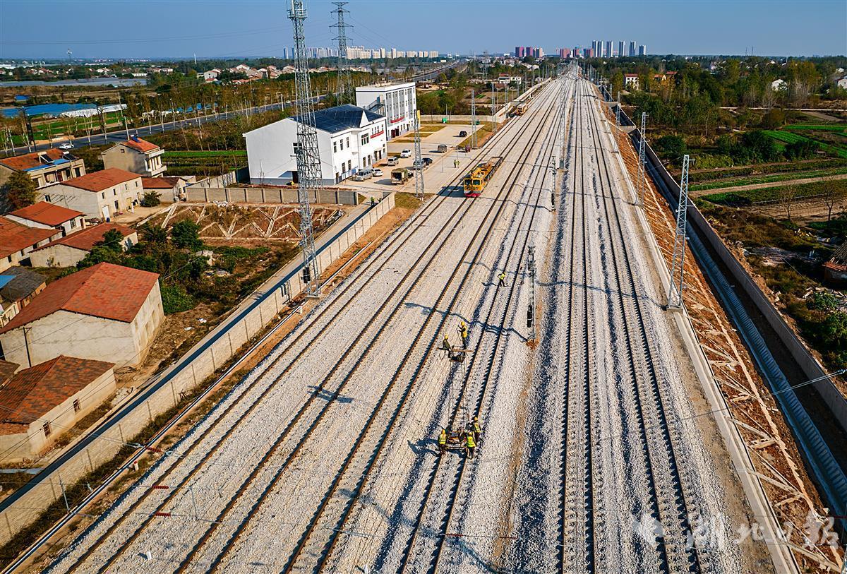 11月2日,鸟瞰位于新洲星谷大道段的武汉新港江北铁路,目前已完成轨道铺设,正进入电器安装和调试阶段。该铁路位于长江以北,西起武汉市黄陂滠口站,东至黄冈市黄州站,全长80.39公里。据了解,该铁路是中国“四纵四横”铁路专线规划的一条货运铁路,建成后既可以实现铁水公多式联运,又可与京广、京九铁路大动脉相连,对武汉长江中游航运中心建设意义重大。(湖北日报全媒记者 朱熙勇 摄)