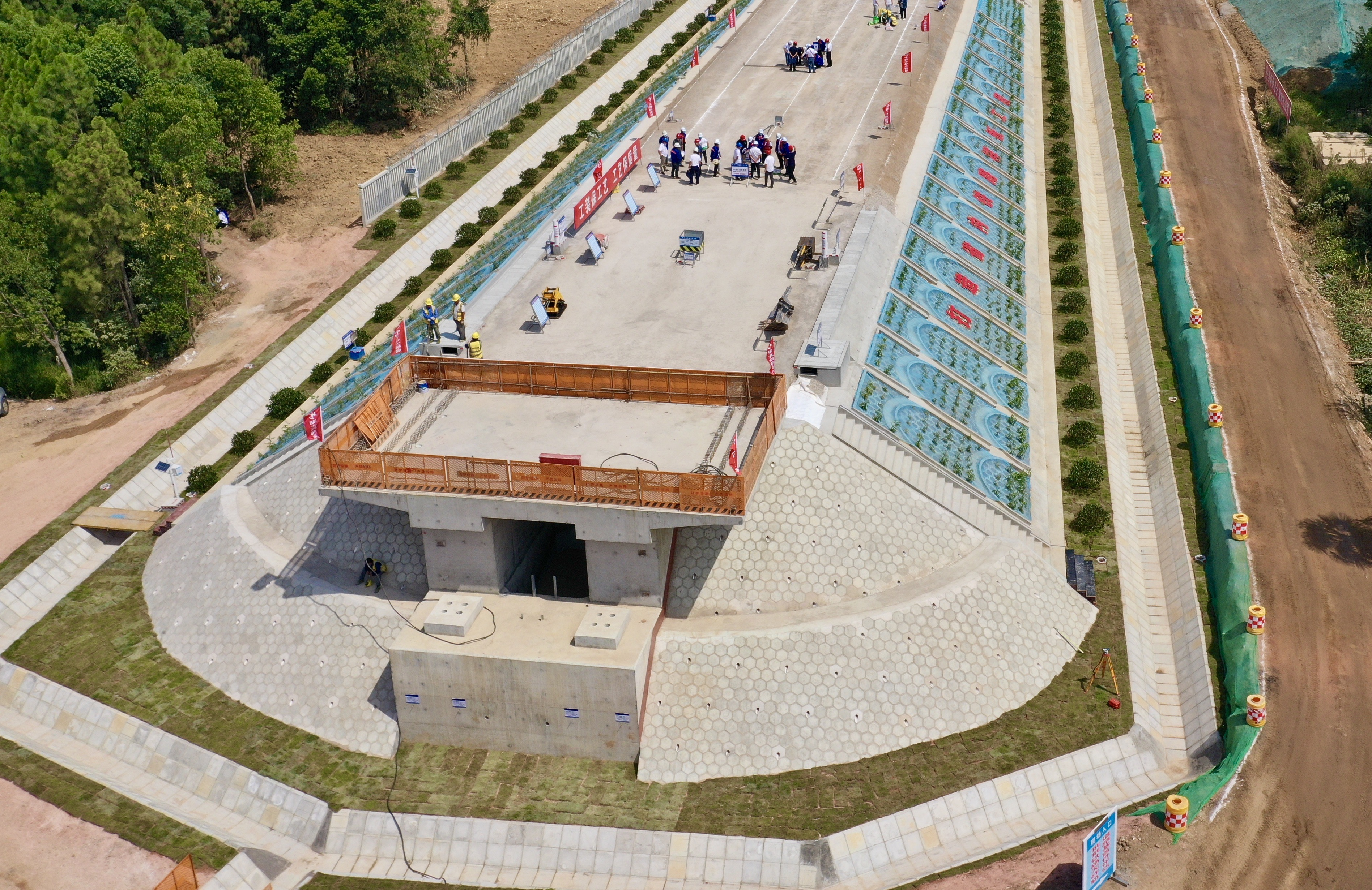 国铁集团工管中心专家刘好正代表专家组宣布荆荆铁路路基首件工程评估顺利通过。专家组对荆荆铁路首件路基工程的现场标准化文明施工管理、实体外观质量表示肯定,对荆荆铁路路基施工过程中积极推广应用先进工装工艺的做法给予高度评价。评估现场同步展示了桩帽定型成形器、排水沟定型挖斗、三七灰土专用振捣器、栅栏基础开挖工装、接触网支柱螺栓定位装置,六棱块铺设定位卡具、路基边坡坡度尺等新工装,详细介绍了梯形沟分节安装、螺杆桩“前截法”施工等新工艺的开展情况。