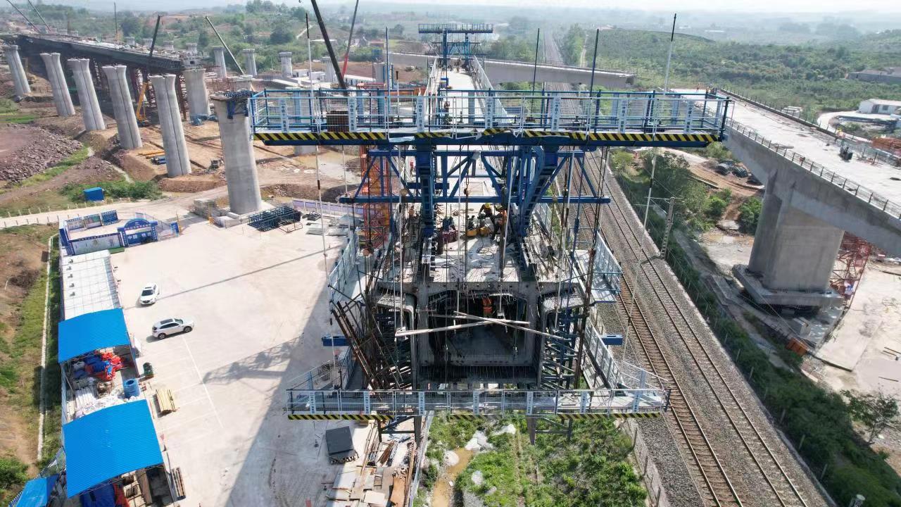 原来,荆荆高铁荆门特大桥将横跨焦柳铁路,14、15号墩体紧邻繁忙的焦柳线,列车每隔不到10分钟便通过这里。为保证施工作业不影响列车安全通行,大桥与焦柳线相交点的施工采取“悬臂浇筑+转体”的施工工艺,即先沿焦柳铁路平行浇筑桥梁,跨线桥梁完成后,再牵引桥体旋转跨过焦柳铁路,与另一侧桥梁对接,整个过程不会超过40分钟,大大降低了事故风险。