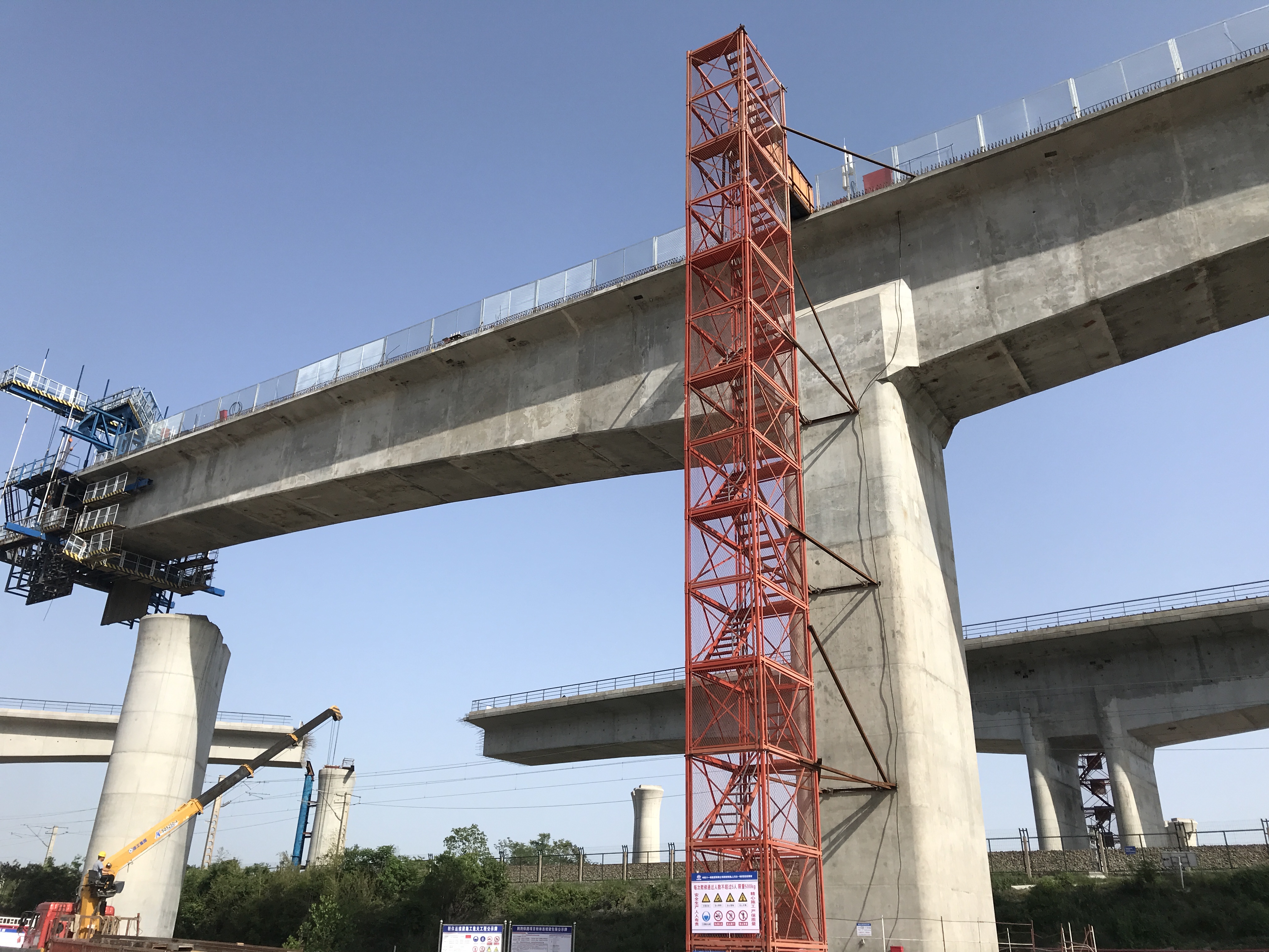 “五一”假期,小编来到荆荆高铁荆门特大桥右线跨焦柳线特大桥转体T构梁施工现场。巨大的T字形转体梁高约29m,在悬臂T构梁两头,工人师傅用施工挂篮将一块块节段梁用混凝土浇筑成型。本月中旬,这座约4600吨重的梁体将由工程技术人员操作,完成“华丽”转体。