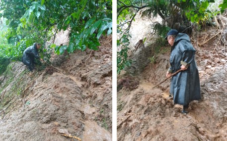 7月6日清晨,连日的暴雨导致余延秋居住房屋后山发生山体滑坡,后山上的树木也被雨水冲刷倾斜,危及住房安全。灾情就是命令,驻村工作队收到求助后立刻赶往现场,在摸清状况后,队员们齐心协力,在边坡上开辟出一条疏水渠道。为防止倾斜的树木滑下山坡砸毁房屋,工作队又架起梯子,提起镰刀,清除树木残枝,排除安全隐患,让余延秋两口子悬着的心落了地。
