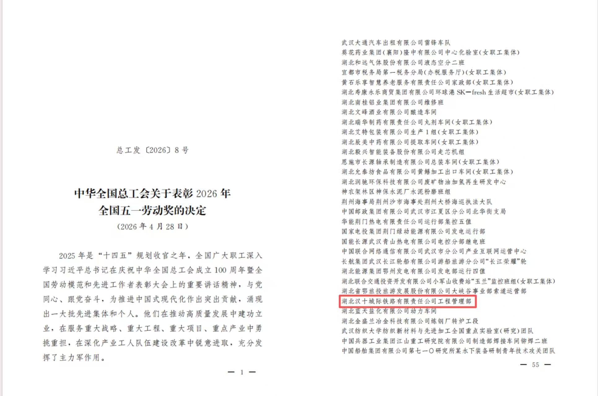 4月28日,中华全国总工会召开庆祝“五一”国际劳动节暨全国五一劳动奖表彰大会,发布关于表彰2026年全国五一劳动奖的决定。湖北铁路集团所属湖北汉十铁路公司工程管理部(以下简称:汉十公司工程部)荣获“全国工人先锋号”荣誉称号。