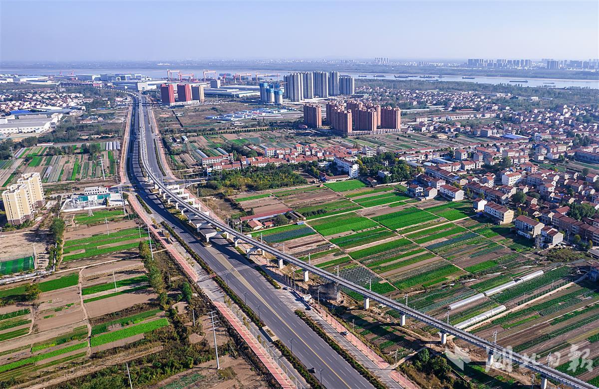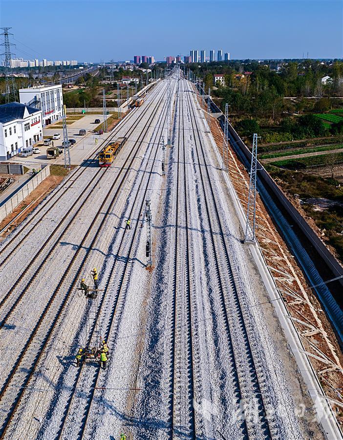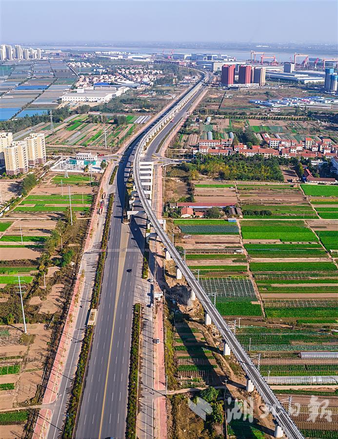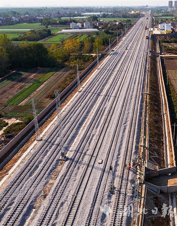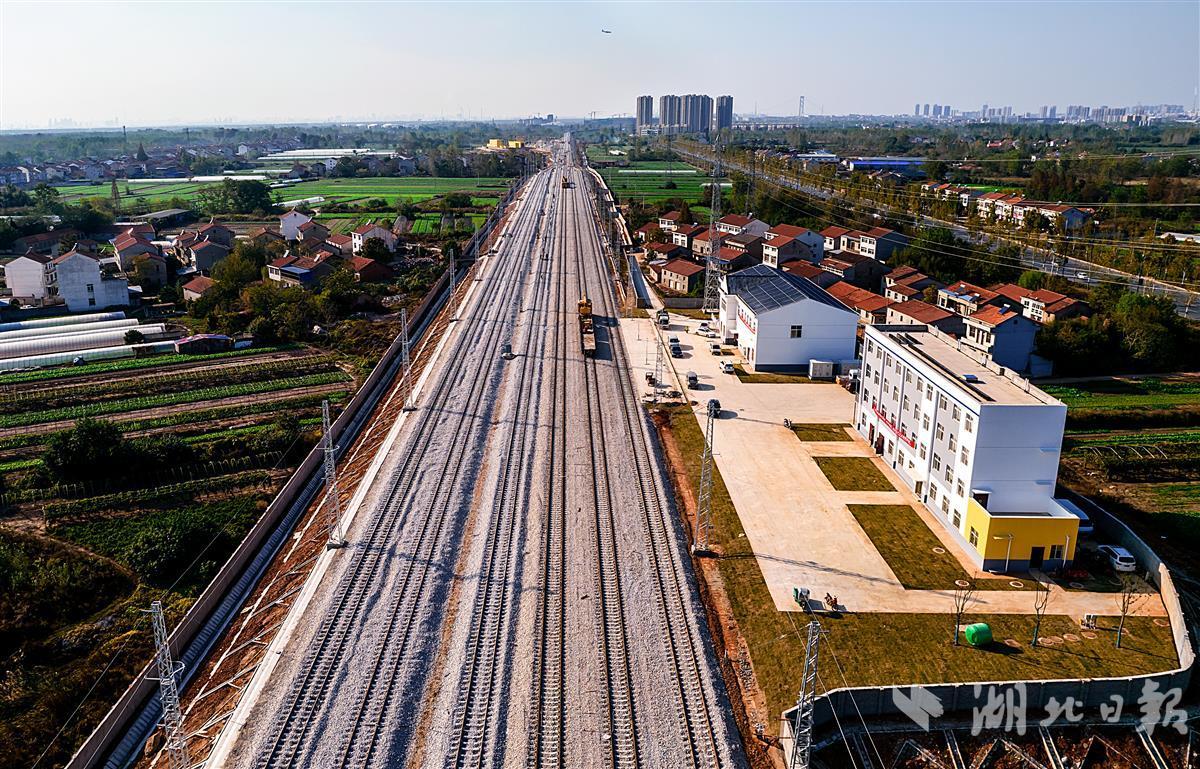 11月2日,鸟瞰位于新洲星谷大道段的武汉新港江北铁路,目前已完成轨道铺设,正进入电器安装和调试阶段。该铁路位于长江以北,西起武汉市黄陂滠口站,东至黄冈市黄州站,全长80.39公里。据了解,该铁路是中国“四纵四横”铁路专线规划的一条货运铁路,建成后既可以实现铁水公多式联运,又可与京广、京九铁路大动脉相连,对武汉长江中游航运中心建设意义重大。(湖北日报全媒记者 朱熙勇 摄)