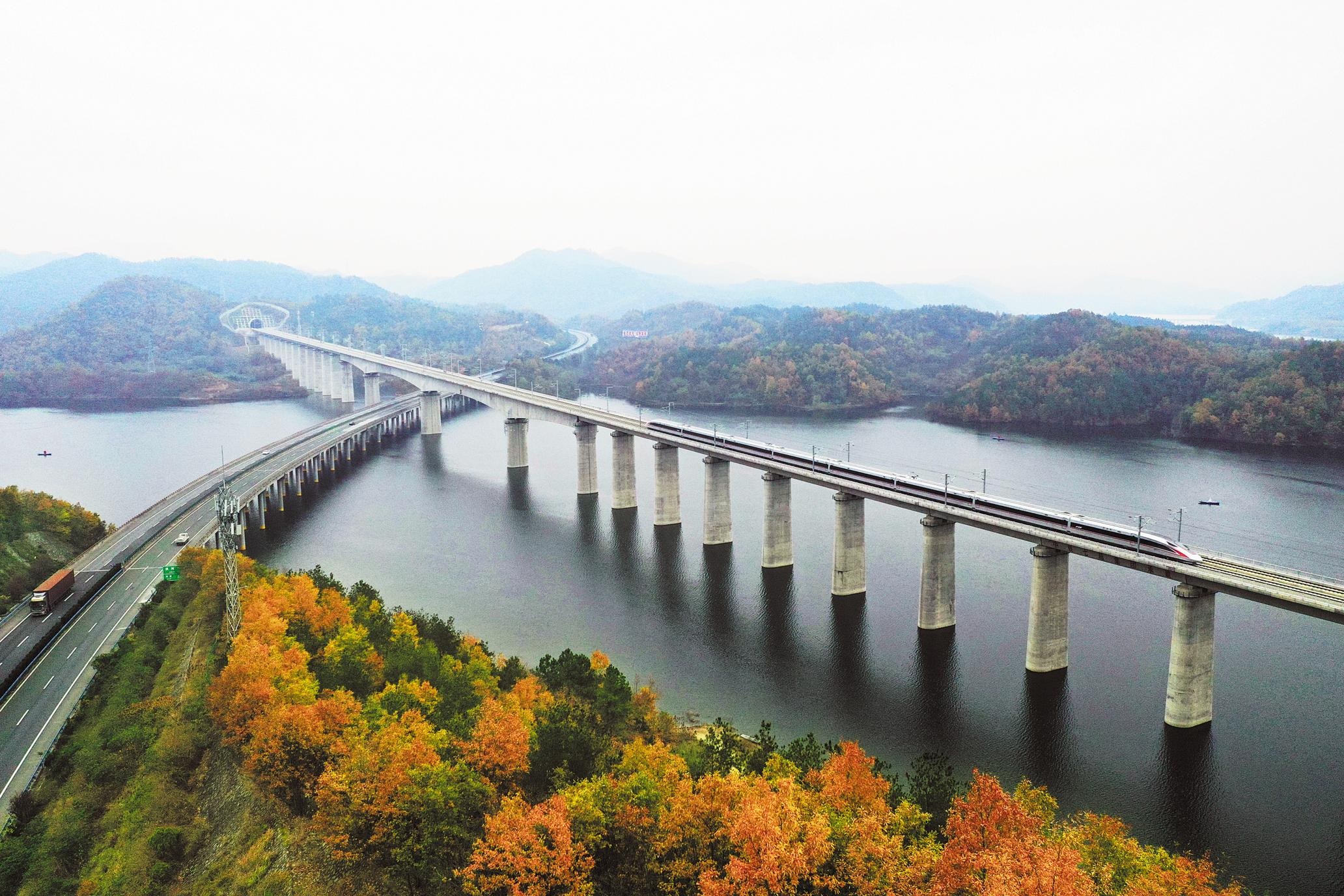 11月29日,十堰东10:25首发G6898次列车经过丹江口水库浪河大桥