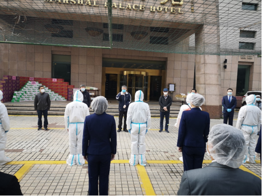 越是危难时刻,越显责任担当。按照“宁可备而不用”的原则,集团提前做好所属酒店的应急接待准备工作。1月31日,集团所属的帅府饭店率先复工,全力服务中部战区总医院医护人员住宿等后勤保障工作。81天的坚守,帅府饭店竭诚服务311名抗疫医护人员,全面保障他们的安全防护和生活起居。中部战区总医院为饭店赠送了一面题为“军民一家亲 同心抗疫情”的锦旗表示感谢。集团所属的帅府铂雅饭店为服务疫情防控一直未停工,先为滞留在店的50人负重前行,后为云南援汉医疗队抗疫医护人员的后勤服务“保驾护航”。